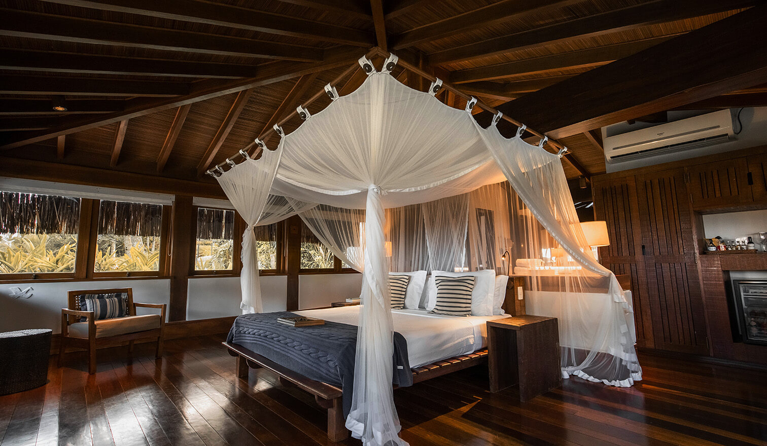 São 60m2 construídos sobre um deck de madeira suspenso, uma varanda privativa e chuveiro externo. Estão distribuídos por todo o terreno do Txai.